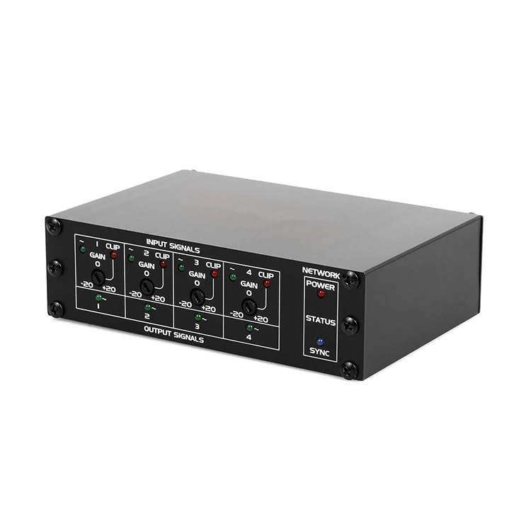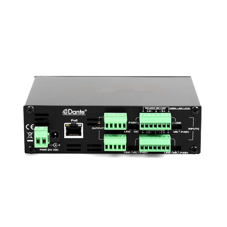 4 -мікрофонний та лінійний вхід Dante Interface - це професійний аудіоінтерфейс, заснований на протоколі мережі Dante, підтримуючи 4 входи мікрофона/лінії та 4 виходи. Основна його перевага полягає в передачі високоякісних, низькокласних звукових сигналів через IP-мережі, що підходить для сценаріїв, які потребують гнучкої проводки, віддаленої передачі або багатоканальної аудіо інтеграції.